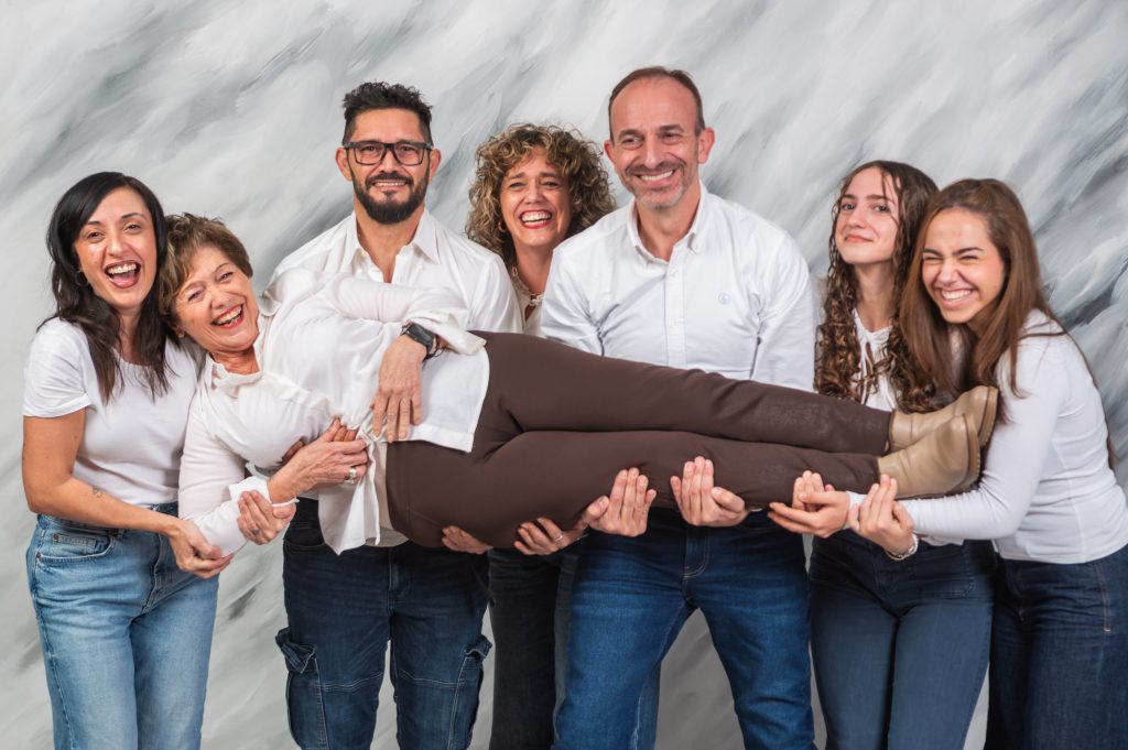 Sesión familiar de estudio en Zaragoza. Hijos y padres divertidos. Familias estupendas.